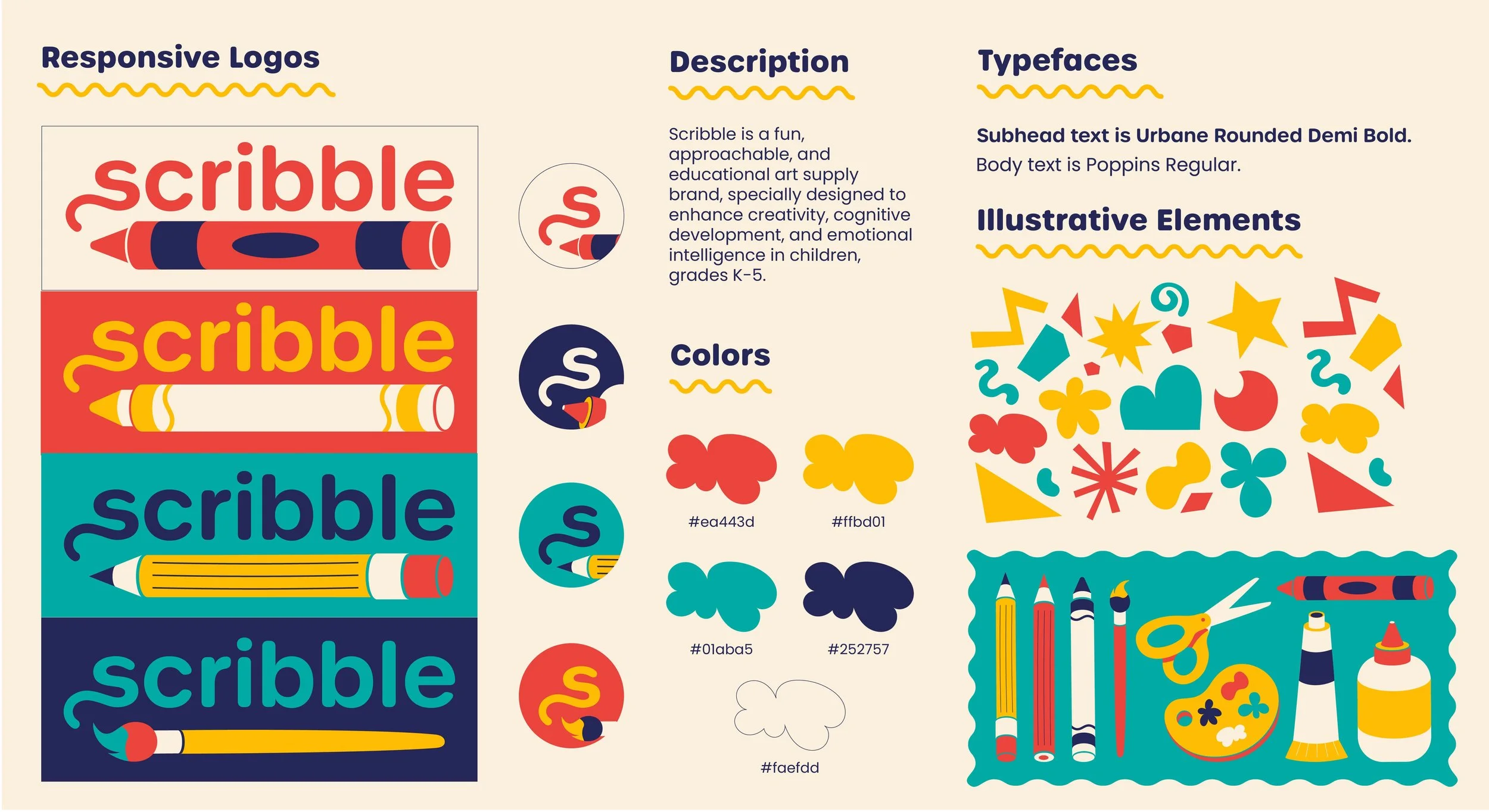 Growing up, there was nowhere that I felt more at home than in the art studio. From a young age, my early exposure to the arts allowed me to explore methods of self-expression, practice my ability to communicate through visuals and enhance my problem-solving skills. For my thesis project, I wanted to create a fun, approachable, and educational art supply brand that highlights the importance of the arts within child development. Through the production of art supplies, print materials, and educational graphics, Scribble is specially designed to enhance creativity, cognitive development, and emotional intelligence in children, grades K-5.